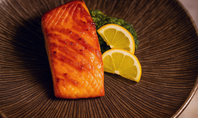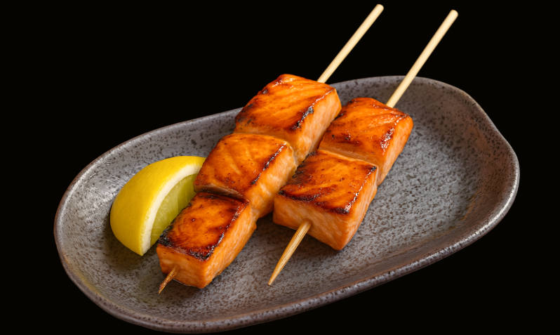 Simply grilled sashimi-grade salmon with teriyaki sauce.