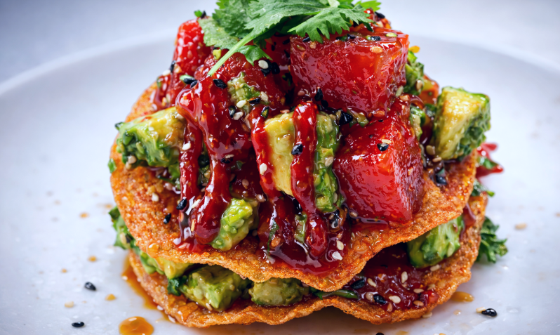 Juicy chicken karaage in a spicy-sweet glaze, served with tartar sauce.